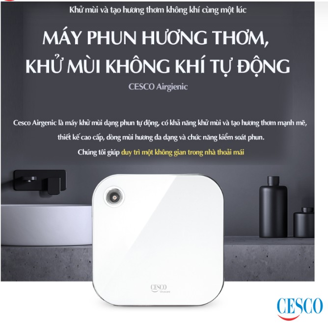 Máy khử mùi tạo hương CESCO được chứng nhận bởi Bộ Môi trường là sản phẩm làm mát không khí và khử mùi dạng xịt tự động đạt chuẩn an toàn và được phép lưu hành trên thị trường với công dụng giúp quản lí không khí trong nhà, xí nghiệp, nhà hàng, khách sạn, khu nghỉ dưỡng,...luôn được đảm bảo trong lành, tỏa hương thơm với các loại tinh dầu cao cấp độc quyền từ CESCO. Ngoài ra, với công nghệ mùi hương cao cấp được nghiên cứu điều chế từ Hàn Quốc cũng đã được công nhận an toàn, CESCO Airgenic sẽ giúp cho không gian sống của bạn luôn tràn ngập hương thơm nhưng vẫn rất tiết kiệm.